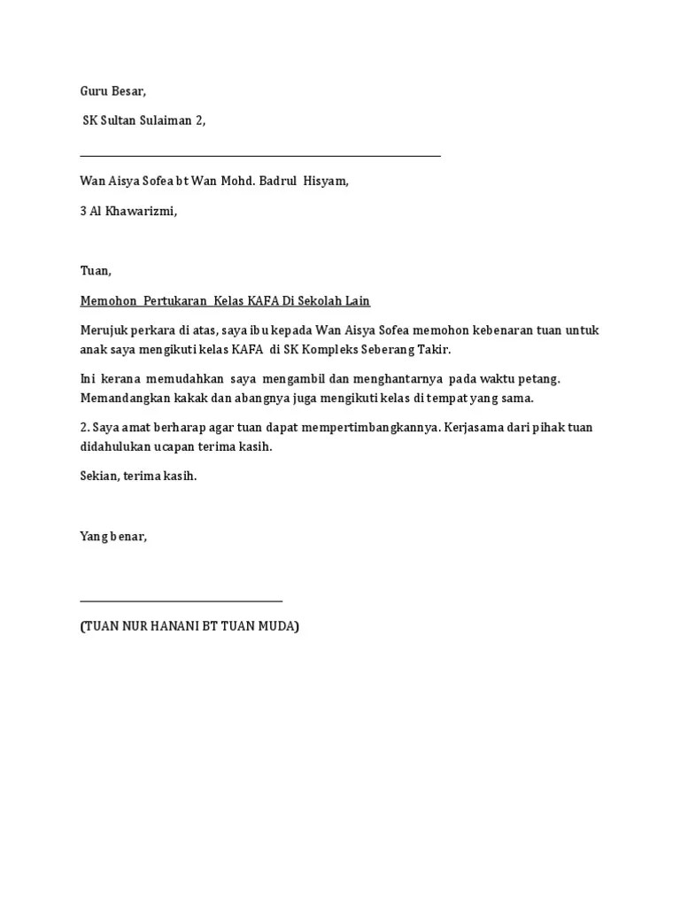 Pihak sekolah hendaklah berbincang secara bersemuka dengan ibu bapa/penjaga dan mendapat persetujuan bertulis sekiranya murid masih ingin menarik diri daripada program ini. Contoh surat rayuan tukar aliran kelas have a graphic from the other.contoh surat rayuan tukar aliran kelas it also will feature a picture of a sort that may be observed in the gallery of contoh surat rayuan tukar aliran kelas. The collection that comprising chosen picture and the best … Surat rayuan kolej vokasional dan smt. Mar 15, 2022 · antara beberapa jenis surat rayuan yang kerap ditulis biasanya melibatkan permohanan rayuan bagi memasuki sekolah berasrama penuh (sbp), rayuan kemasukkan ke maktab rendah sains mara (mrsm), rayuan bagi memohon biasiswa jpn, rayuan pertukaran guru, rayuan mengurangkan bayaran saman dan pelbagai jenis rayuan yang lain. Jul 25, 2019 · kumpulan contoh surat permohonan pertukaran sekolah anak terbaru 2019. Daftar informasi yang wajib disediakan dan diinformasikan secara berkala Pemohon yang berjaya dalam rayuan akan dihubungi … Terdapat situasi yang memerlukan penggunaan surat permohonan pertukaran tempat kerja contohnya guru ingin bertukar tempat kerja disebabkan faktor keluarga. Latest updates and statistic charts. 9.0 pertukaran murid yang mengikuti kelas yang melaksanakan dlp 9.1 pertukaran murid tertakluk kepada prosedur pertukaran murid sedia ada.